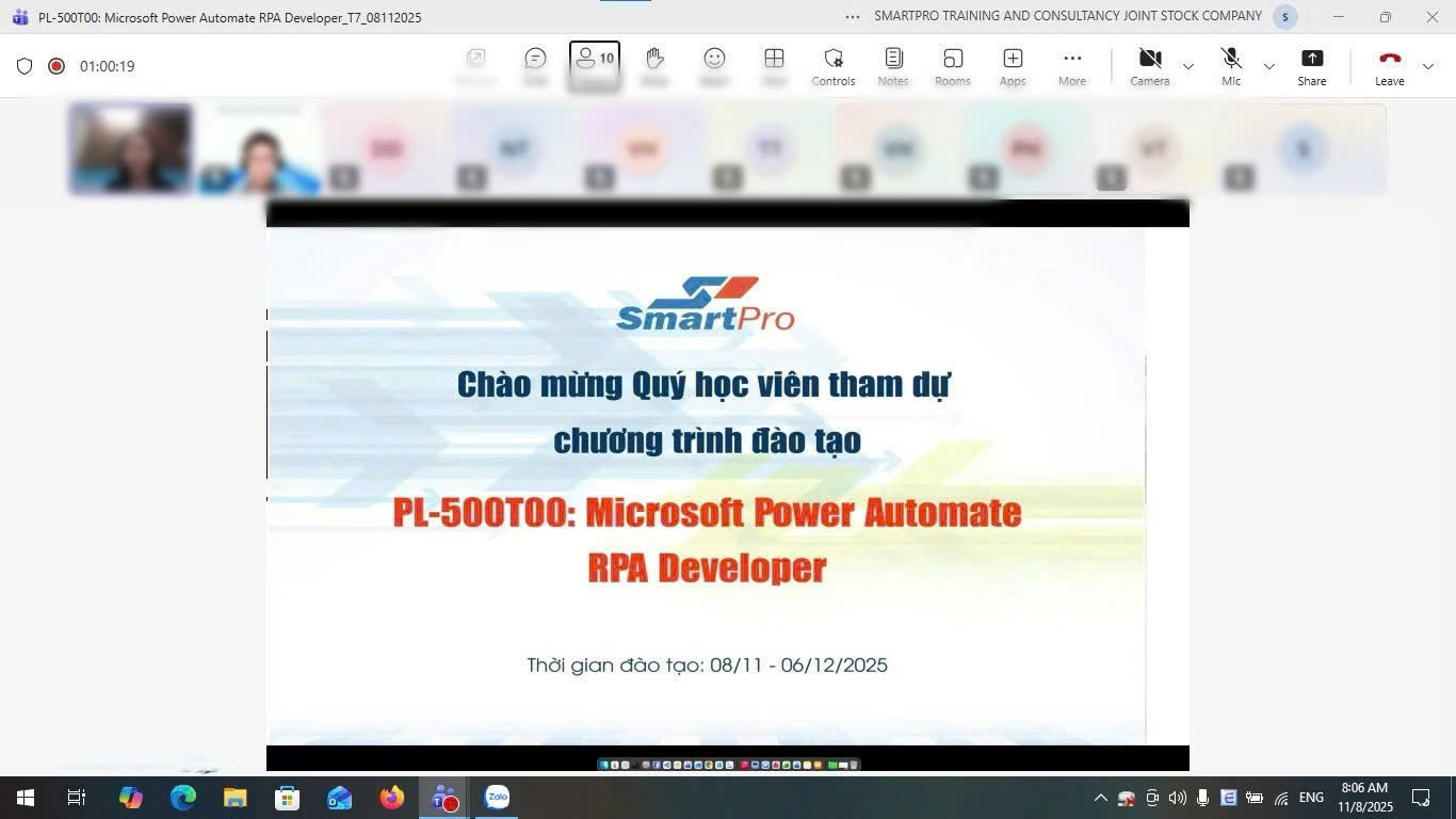 Sáng ngày 08/11, SmartPro hân hoan khai giảng khóa học Microsoft Power Automate RPA Developer (PL-500T00) – chương trình đào tạo chuyên sâu về tự động hóa quy trình doanh nghiệp (RPA), được tổ chức trực tuyến với sự tham gia của đội ngũ CNTT đến từ đơn vị sản xuất hàng đầu Việt Nam.